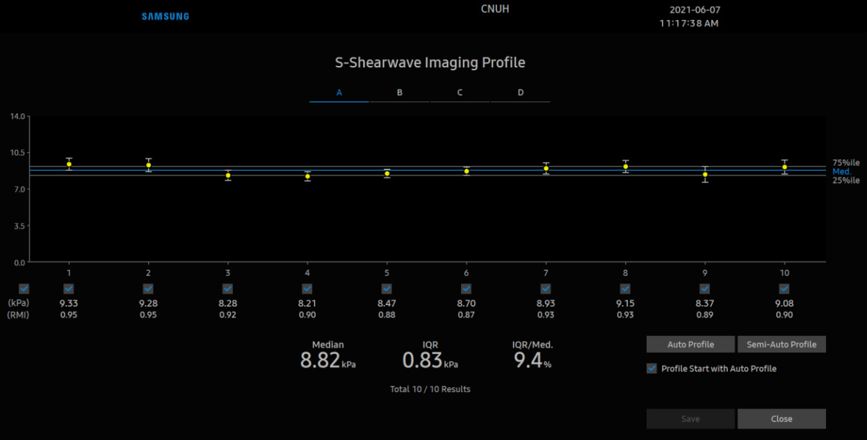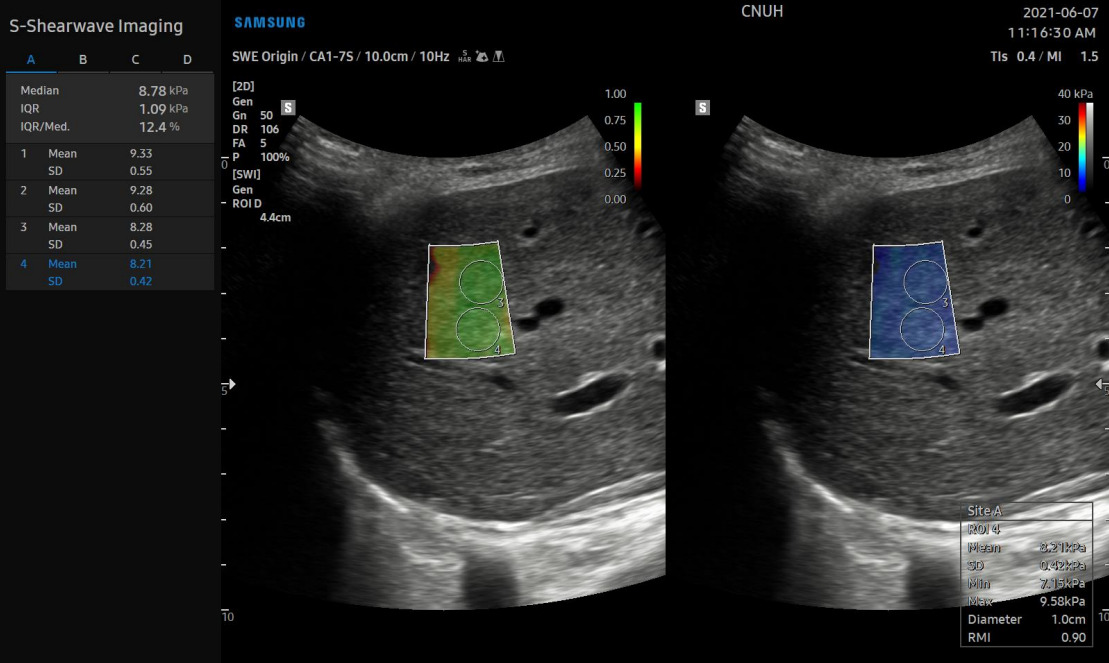 Особенности метода делают SWE портативным и выполнимым в различных клинических условиях. Так, современные ультразвуковые системы способны проводить эластографию печени (сдвиговой волны) с высокой точностью. Например, в УЗ системах Samsung функция эластографии называется 2D-SWE (S-Shearwave Imaging). Было установлено, что пороговые значения для диагностики начального фиброза, прогрессирующего фиброза и цирроза печени, составляют 6,82 kPa при ≥ F2, 8,63 kPa при ≥ F3 и 9,66 kPa при F4 соответственно. Данные значения актуальны только для систем Samsung.