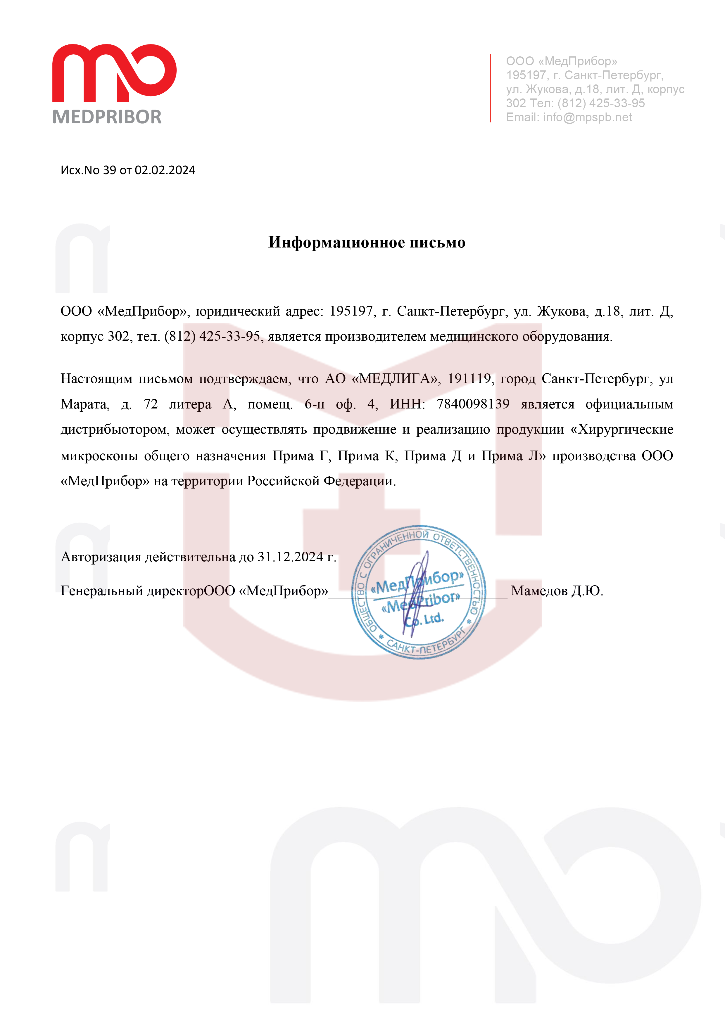 Авторизационное письмо MEDPRIBOR