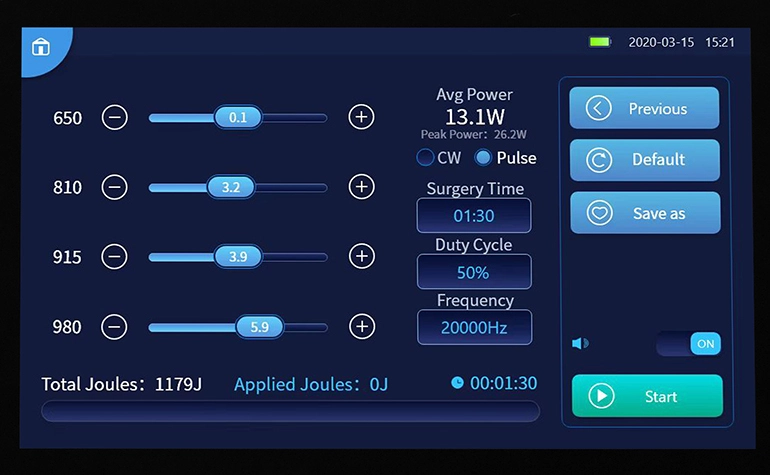 • Несколько режимов: поддержка трех режимов лазерного излучения: режим CW, импульсный режим и режим ISP. Сочетание нескольких режимов позволяет повысить эффективность лечения, уменьшить термические ожоги и интенсифицировать лазерное лечение.
