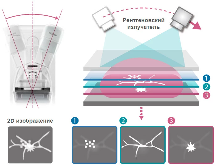 При томосинтезе молочной железы рентгеновская трубка движется по дуге, получая серию рентгеновских снимков с низкой дозой излучения. Изображения, полученные под различными углами, реконструируются в набор срезов томосинтеза, в которых исследуемая структура всегда находится в фокусе.